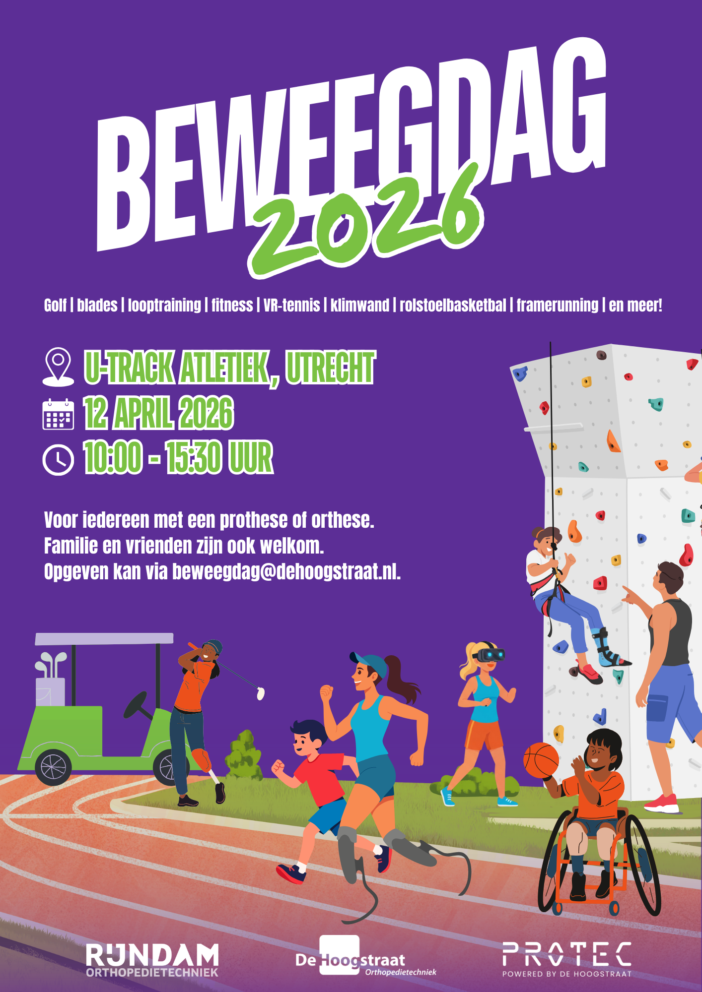 Op zondag 12 april 2026 organiseren Rijndam Orthopedietechniek, De Hoogstraat Orthopedietechniek en Protec de Beweegdag 2026 op de atletiekbaan Maarschalkerweerd (U-Track) in Utrecht. Het wordt een sportieve en gezellige dag voor mensen met een prothese of orthese die willen bewegen, sporten willen uitproberen of anderen willen ontmoeten.